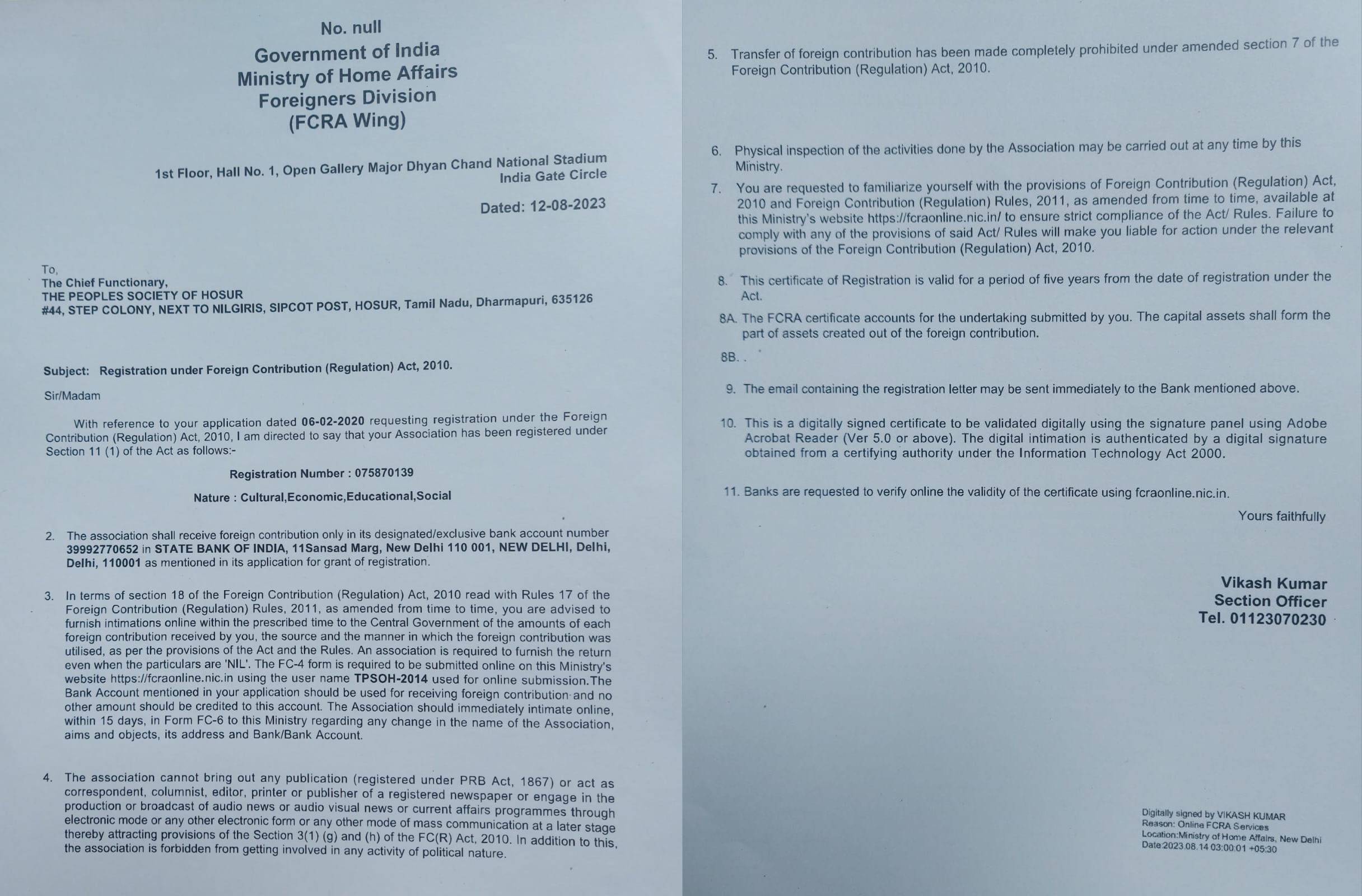 FCRA Registration Certificate received from The Ministry Of Home Affairs , Govt Of India